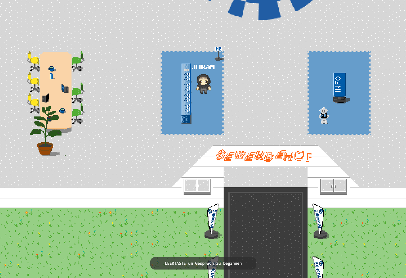 - Mit der LEERTASTE könnt Ihr an bestimmten Stellen mit Objekten interagieren. So könnt Ihr Jitsi-Calls beitreten und Websites öffnen. Ein Hinweis am unteren Bildschirmrand zeigt Euch, wann das möglich ist.