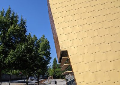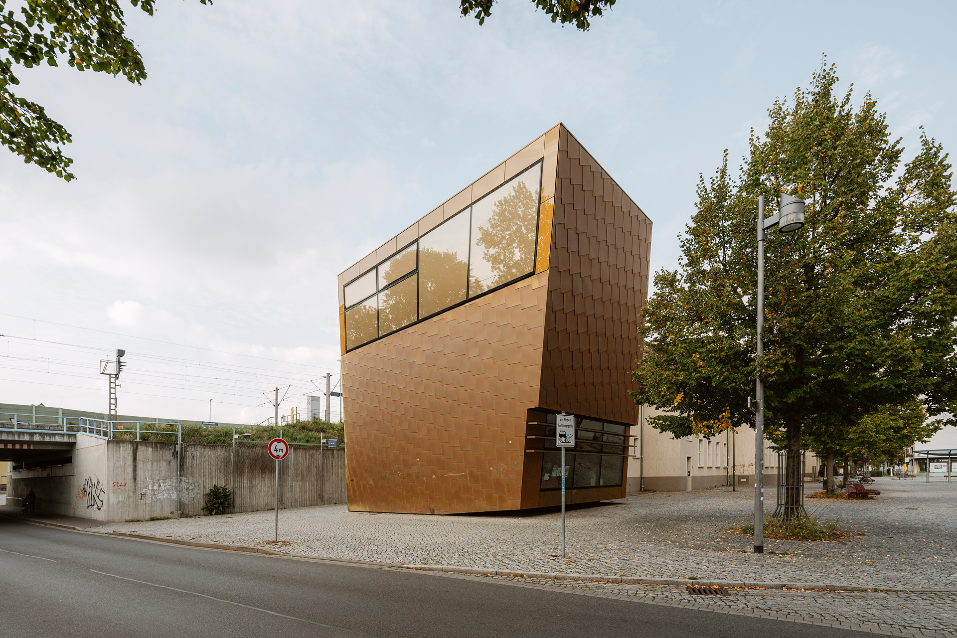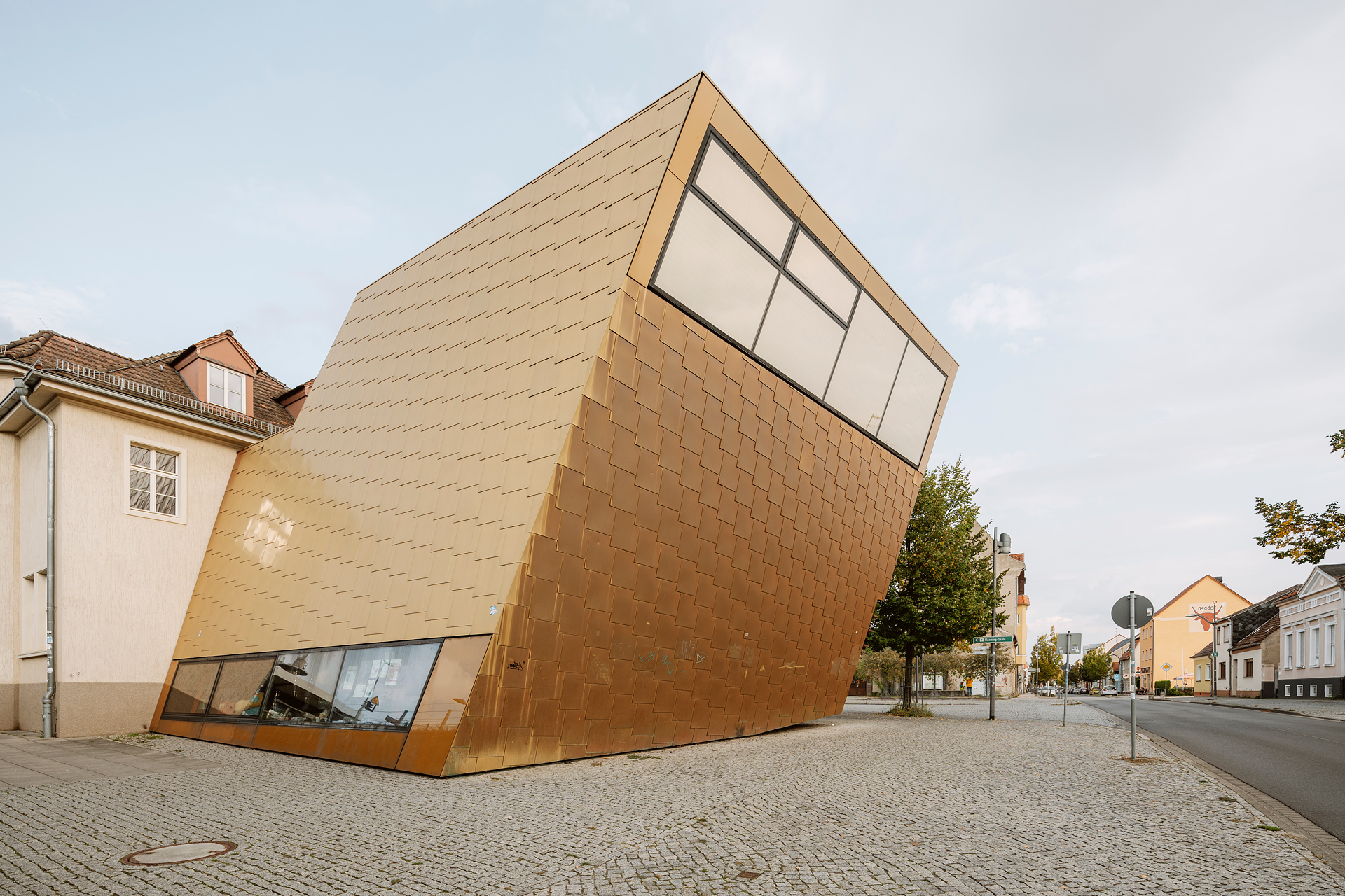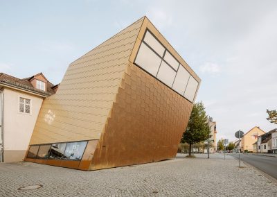 Die markante, goldschimmernde, schuppenartige Fassade der Stadtbibliothek, die 2008 fertiggestellt und 2009 mit dem Baukulturpreis des Landes Brandenburg ausgezeichnet wurde, ist ein echter Hingucker und ein modernes Wahrzeichen Luckenwaldes. Ihr liegt die Idee zugrunde, einen Ort der Kommunikation und Mobilität zu schaffen.